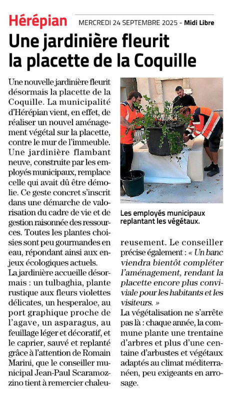 Hérépian : Une jardinière fleurit la placette de la Coquille