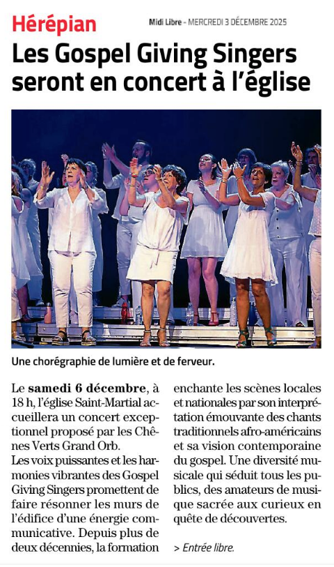 Hérépian : Le Gospel Giving Singers seront en concert à l'église